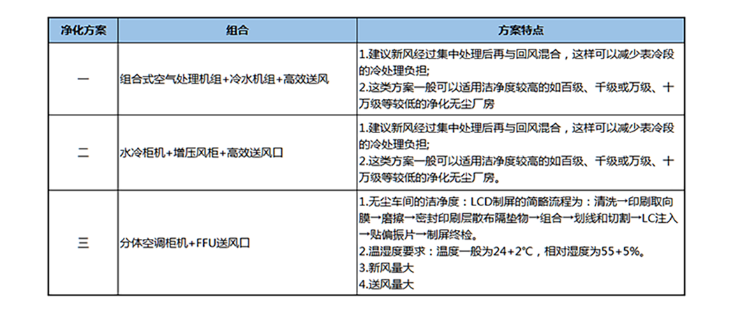 方案一:目前來說是最傳統的凈化空調設計方案。組合式空氣處理機組里含有各種功能段,如初效過濾段、混合段、表冷段、中效過濾段、二次回風段(或中間段)加濕段、加熱段、風機段等。其中冷源主要由冷水機組提供。方案二:相較于方案一,方案二是比較簡單的潔凈空調設計方案。不僅可以大大地縮小機房的面積,還可以讓水冷柜機根據具體的情況布置在較小的凈化車間內或機房內,同時還可以將增壓風柜布置于機房內或吊在機房內或在夾層內。