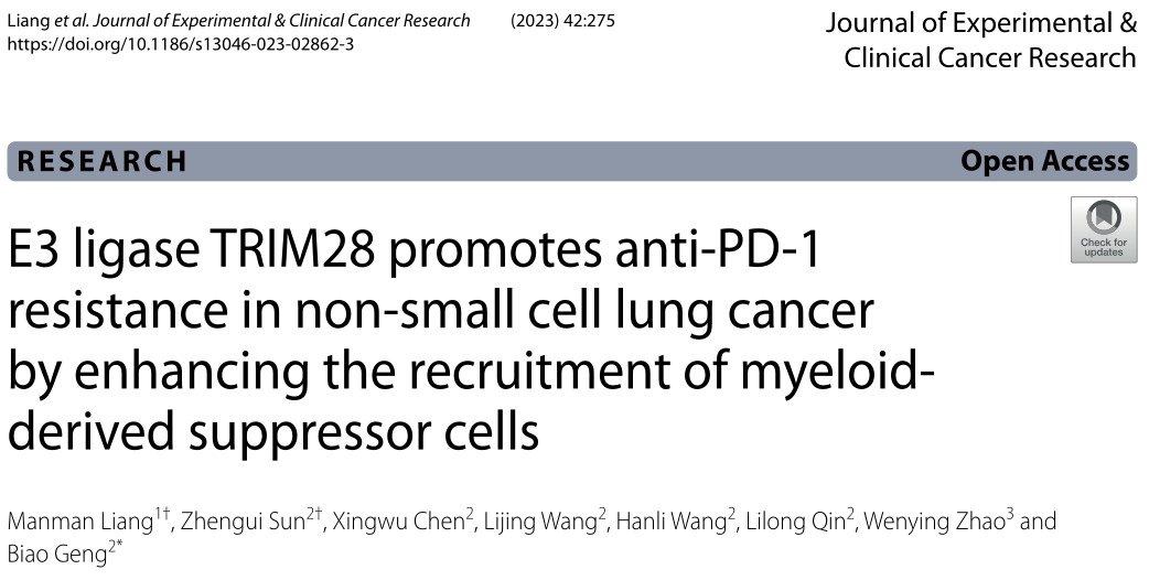 近日,來自皖南醫學院的研究者們在J Exp Clin Cancer Res.雜志上發表了題為“E3 ligase TRIM28 promotes anti-PD-1 resistance in non-small cell lung cancer by enhancing the recruitment of myeloid-derived suppressor cells” 的文章,該研究表明TRIM28通過ripk1介導的NF-κB激活,作為趨化因子驅動的MDSCs募集的啟動子,導致浸潤性活化CD8+T細胞受到抑制,并產生抗pd -1耐藥性。