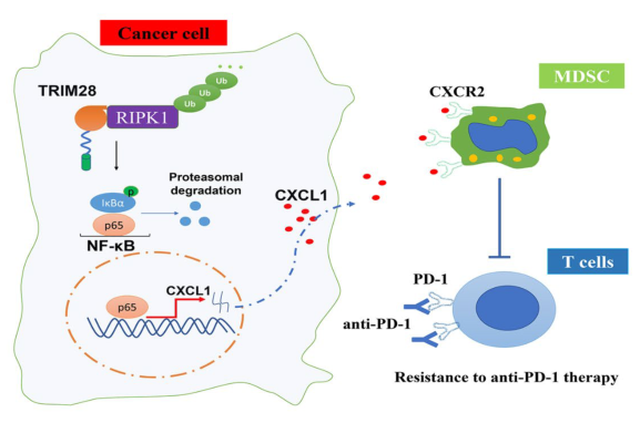 研究結果顯示TRIM28的表達與NSCLC中抑制性髓源性抑制細胞(MDSCs)的浸潤呈正相關。此外,沉默TRIM28可通過重塑炎癥腫瘤微環境來增強抗pd -1免疫治療的療效。在機制上,研究者證明TRIM28可以物理地與受體相互作用蛋白激酶1 (RIPK1)相互作用,并促進k63相關的RIPK1泛素化,這對于維持NF-κB通路的激活至關重要。E3連接酶結構域的突變證實了E3連接酶活性在trim28介導的NF-κB激活中的重要作用。進一步實驗發現TRIM28可通過激活NF-κB信號通路上調CXCL1的表達。CXCL1可與MDSCs上的CXCR2結合,促進其向腫瘤微環境遷移。TRIM28敲除增加了免疫功能小鼠對抗pd -1治療的反應性,其特征是CD8+T腫瘤浸潤淋巴細胞增加,MDSCs減少。